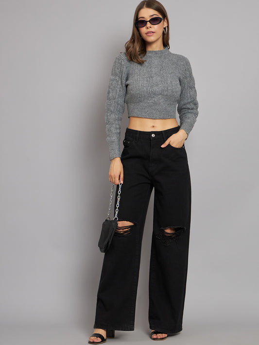 Round Neck Full Sleeve Crop Dark Grey Sweater