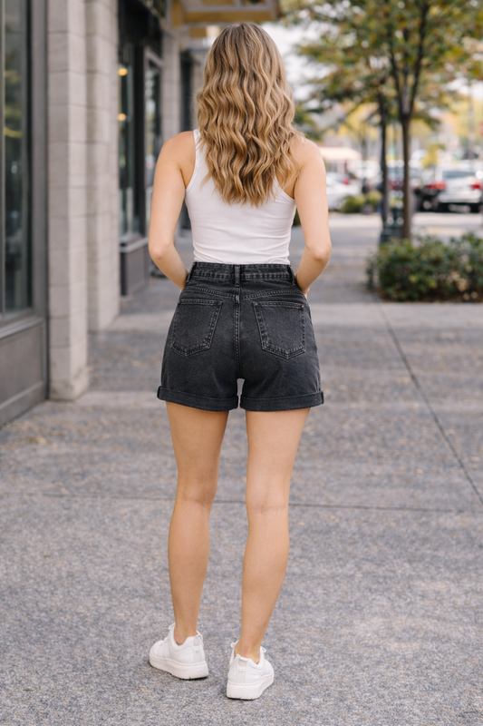 High-Rise Grey Denim Shorts with Frayed Hem (60% Cotton, 40% Lyocell)