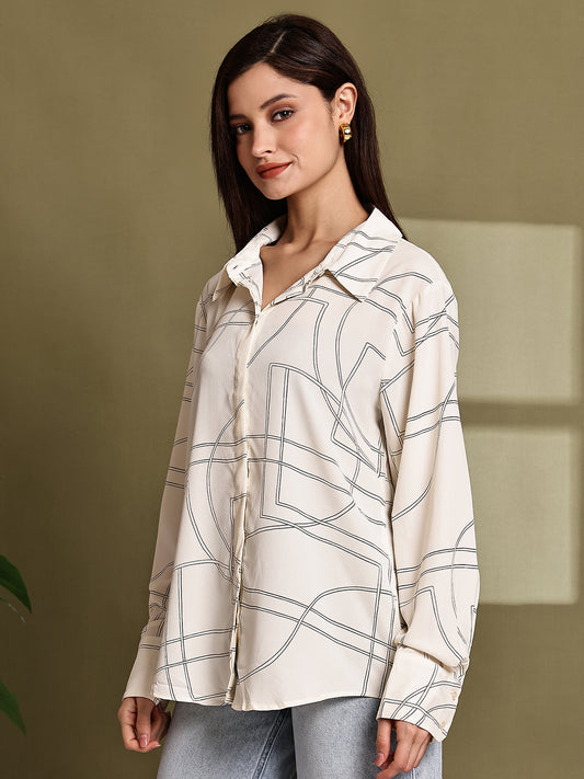 Polyester Cream Printed Loose Fit Polyester Shirt