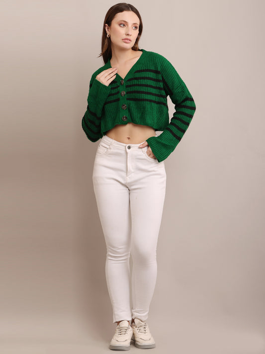Acrylic Full Sleeve with V-Neck Striped Cropped Green Cardigan