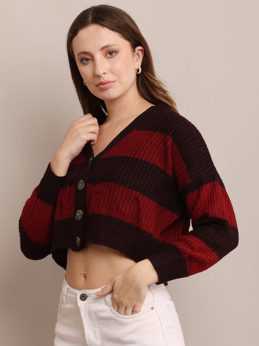 Acrylic Full Sleeve with V-Neck Striped Cropped Maroon Cardigan