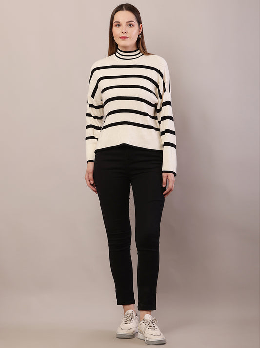 Acrylic High-Neck Full Sleeve Striped Cream and Black Sweater