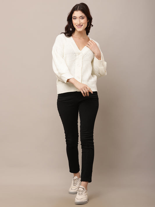 Acrylic Full Sleeve with V-Neck White Cardigan