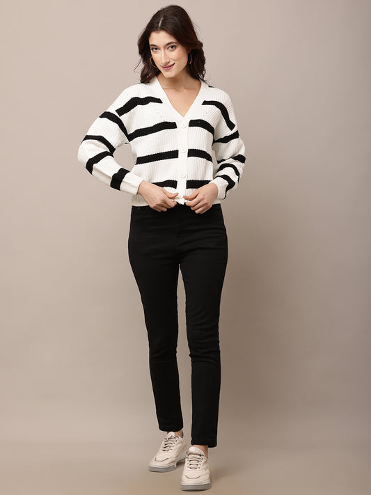 Acrylic Full Sleeve with V-Neck White Striped Cardigan