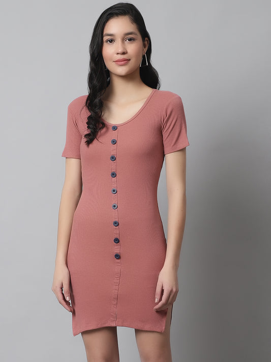 Cotton Bodycon Knee Front False Button Closure Peach Dress