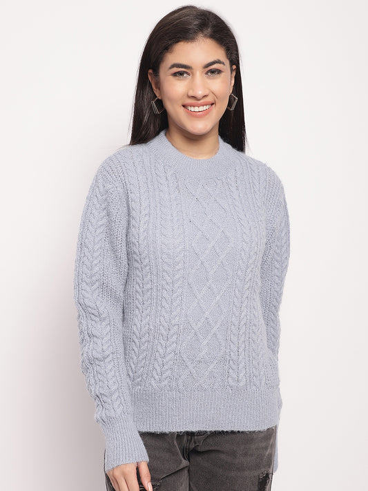Acrylic Round Neck Full Sleeve Cable Knit Light Blue Sweater