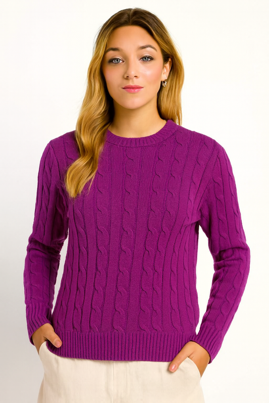 Purple Cable Knit Cotton Sweater | Round Neck Full Sleeve Winter Pullover | Soft & Comfortable Knitwear