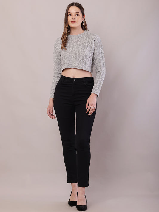 Acrylic Full Sleeve with Round Neck Light Grey Crop Sweater
