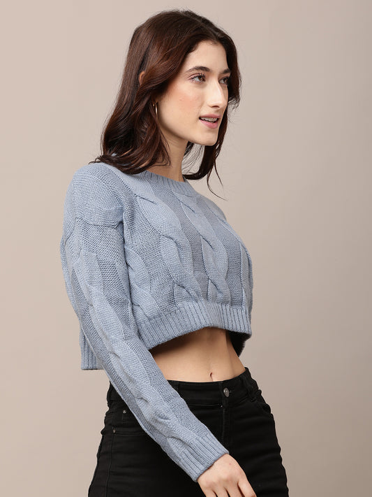 Acrylic Full Sleeve with Round Neck Blue Crop Sweater