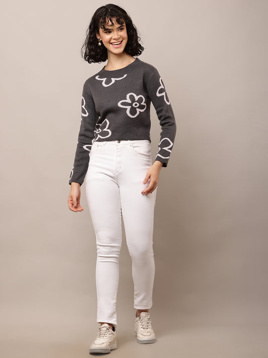 Acrylic Full Sleeve with Round Neck Floral Print Dark Grey Sweater