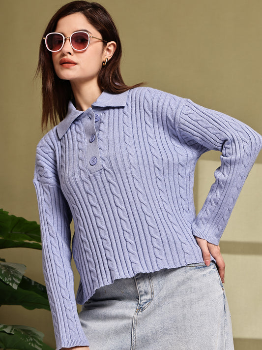 Acrylic Full Sleeve with Blue Cable Knit Polo Sweater