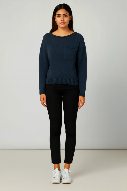 Relaxed Fit Knitted Sweater 100% Acrylic, Boat Neck, Long Sleeves, Front Patch Pocket Blue