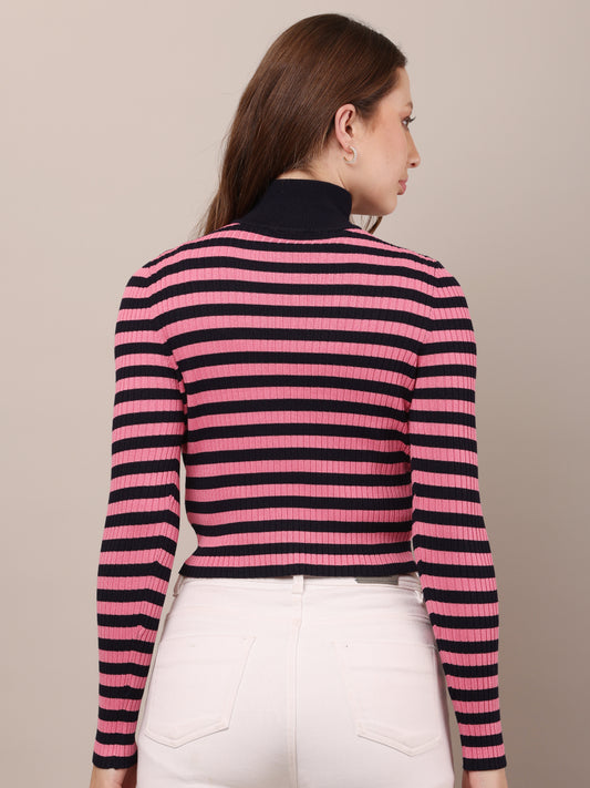 Viscose Full Sleeve with High-neck stripe Pink Sweater