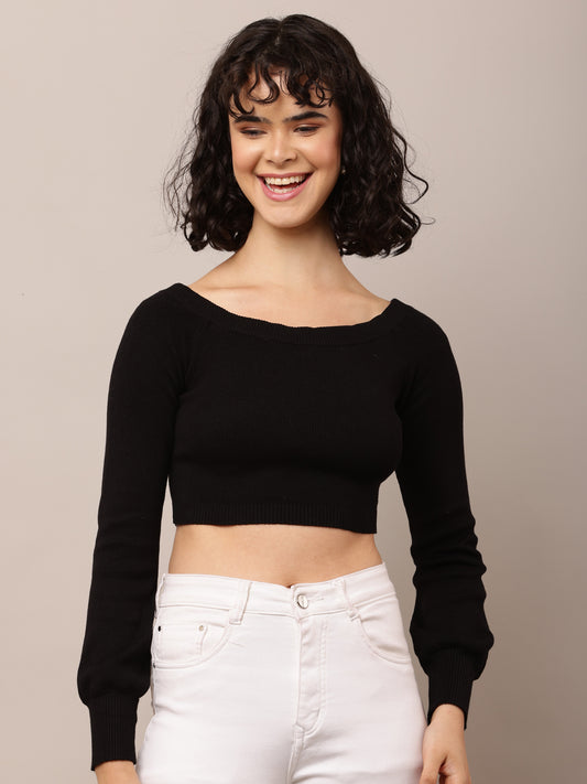 Viscose Full Sleeve with Boat Neck Ribbed Black Crop Top