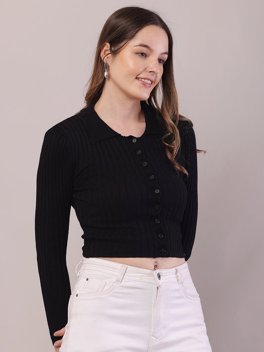 Viscose Full Sleeve with Shirt Collar Ribbed Crop Black Cardigan