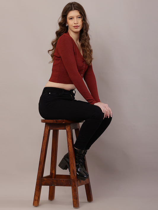 Viscose Full Sleeve with V-Neck Ribbed Brown Cardigan