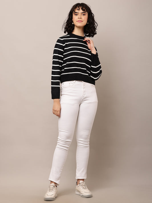 Acrylic High-Neck Full Sleeve Striped Cream and Black Sweater