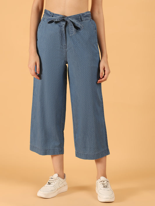 Blue Polka-Dot Print Cotton Culottes with Waist Tie Wide leg