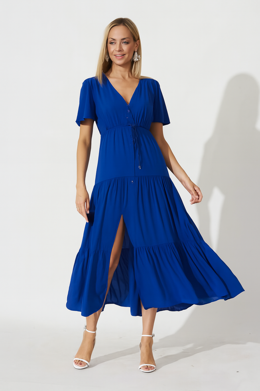 Blue Tiered Maxi Dress with Cinched Waist & Side Pockets