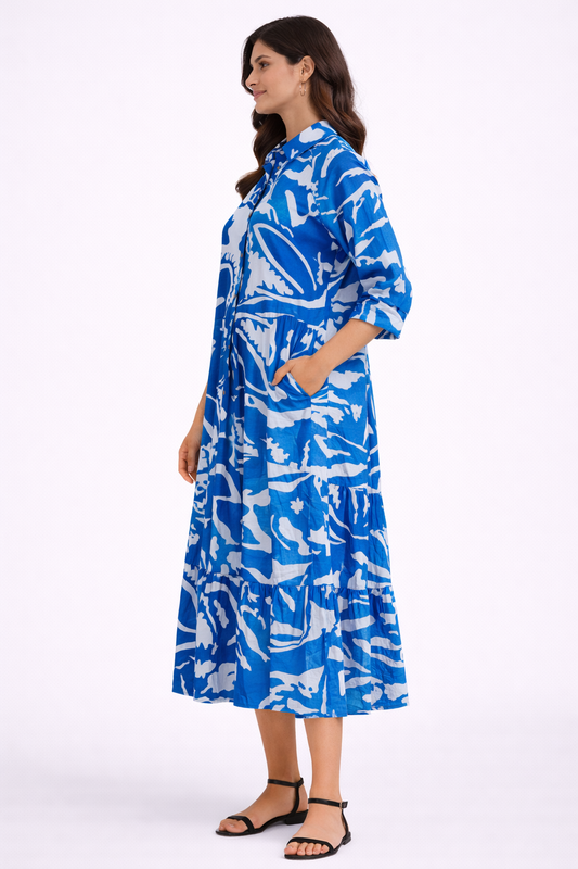 Blue Printed Viscose Shirt Midi Dress | Relaxed Fit