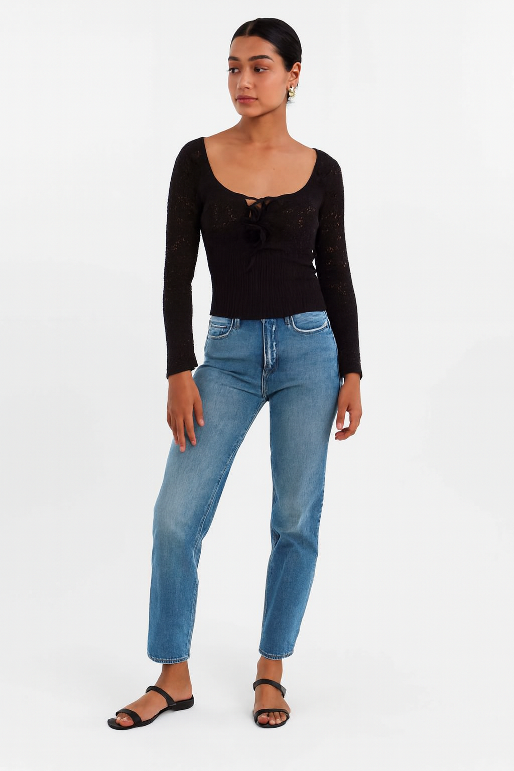 Model is Wearing Small Size. This women’s black knitted sweater is designed for both style and comfort. Made from 100% acrylic material, it offers a soft and lightweight feel, perfect for everyday wear. The sweater features a stylish tie-front design with a square neckline and full-length sleeves, giving it a modern and elegant look. The fit is comfortable with chest & bust measurements being the same, ensuring a neat and flattering shape. Ideal for casual outings, office wear, or layering during mild winters, this sweater pairs well with skirts, jeans, or trousers.