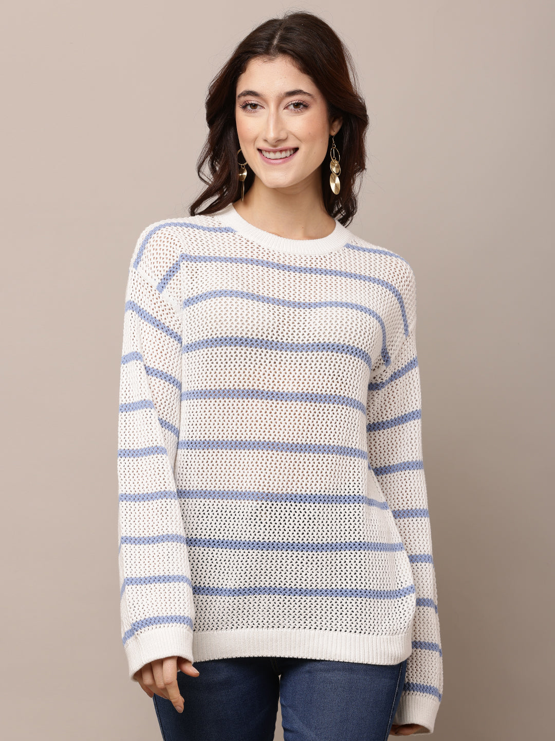 Acrylic Full Sleeve with Round Neck Striped White Sweater