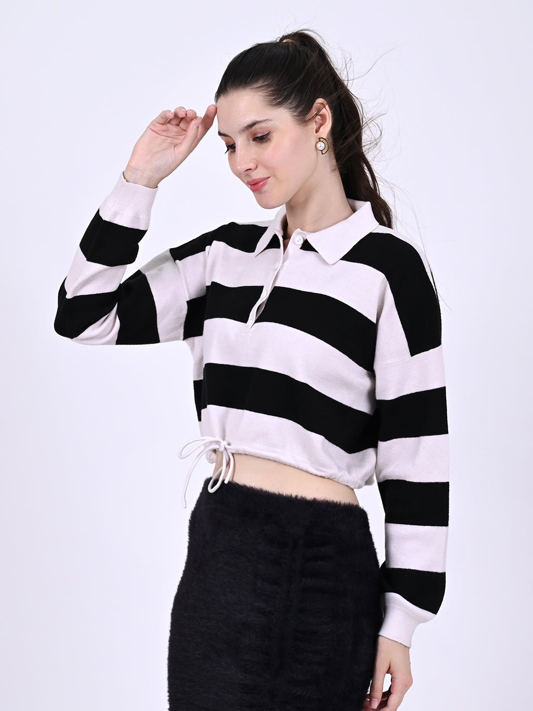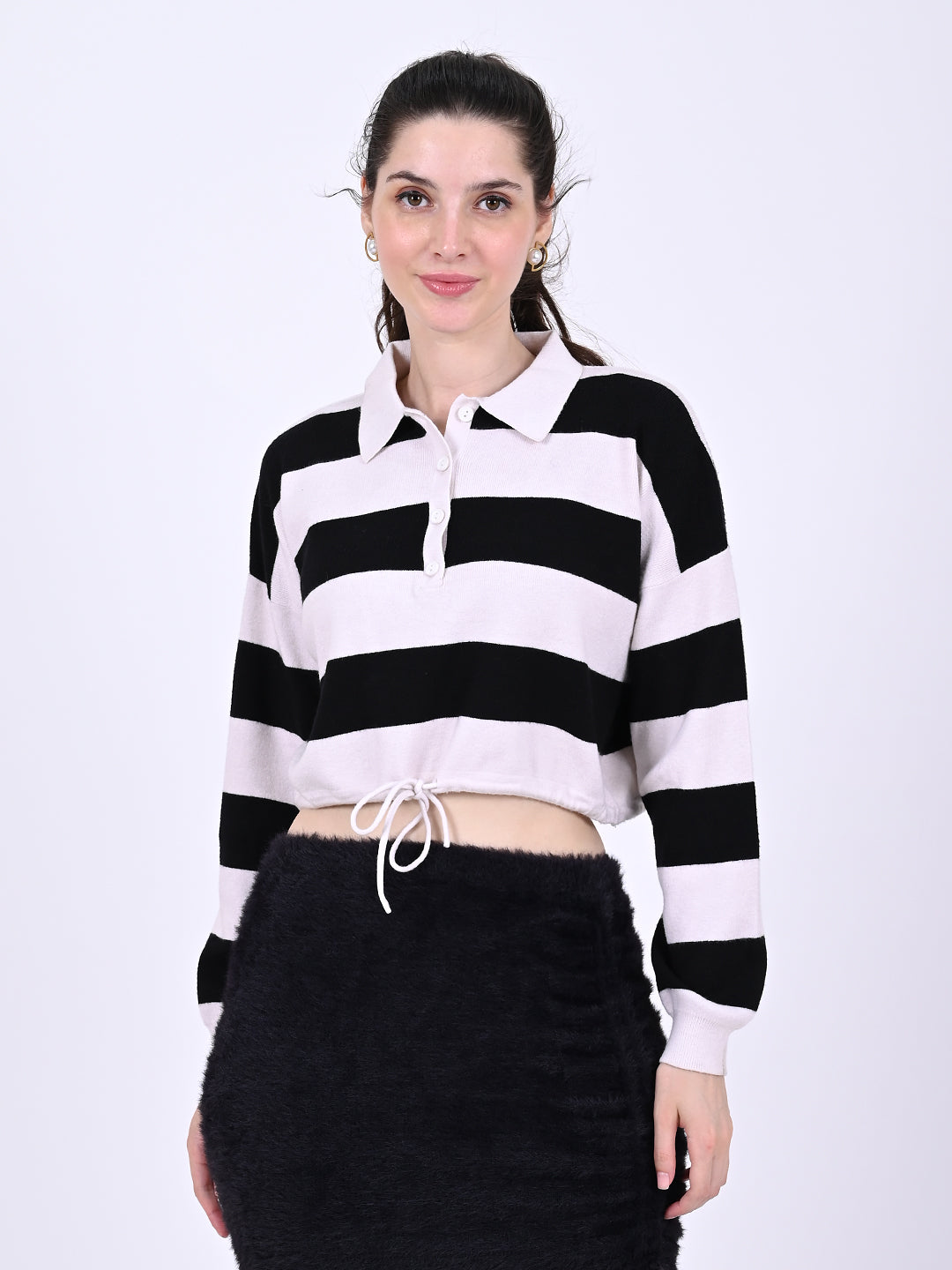 Model is wearing small size .Black and white this polo shirt features button front, polo collar, long sleeve and drop shoulder. Easy to pair with jeans, skinny leggings and so on. Suitable for casual daily wear, date, work, weekend, shopping. Made of 100% Acrylic