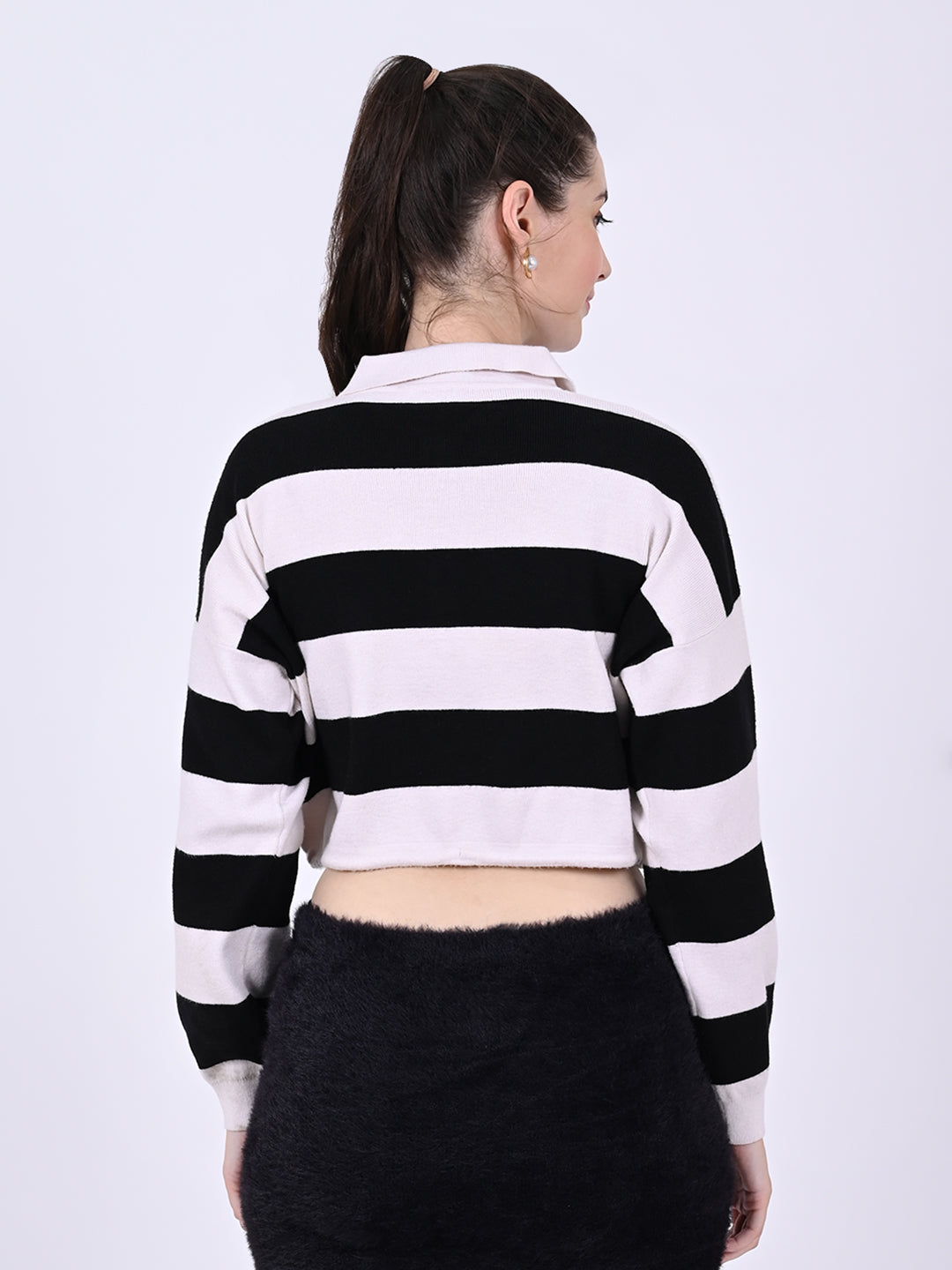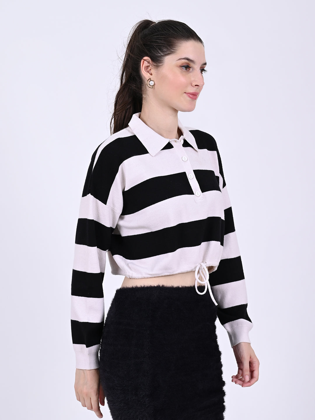 Acrylic Full Sleeve with shirt Collar Button Front Striped Polo Shirt Striped Top