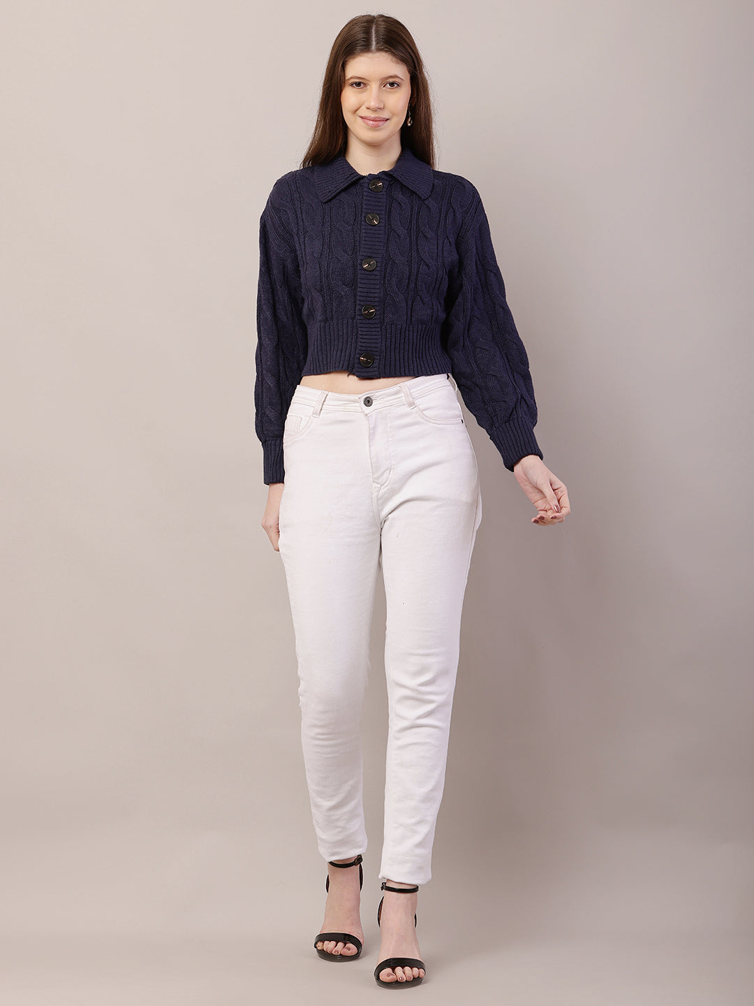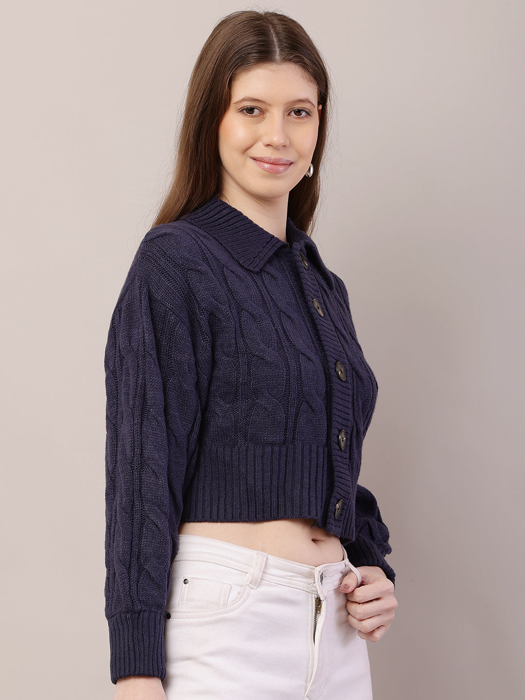 Acrylic Full Sleeve with Shirt Collar Dark Blue Cardigan