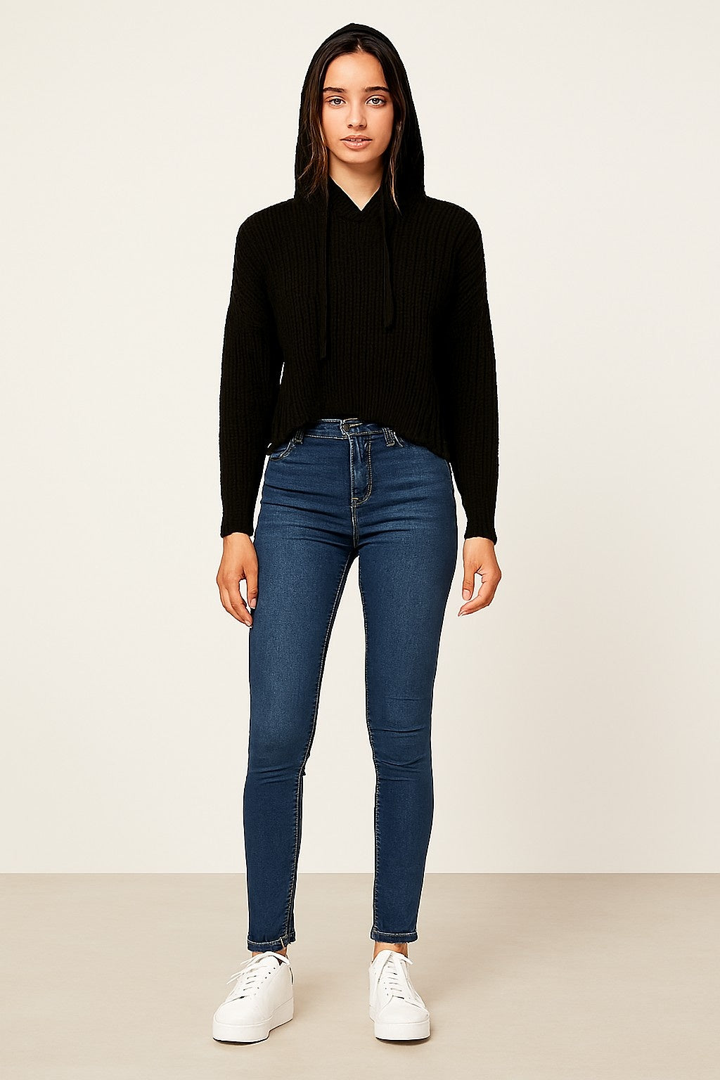 Model is Wearing Small Size. Add warmth and effortless style to your winter wardrobe with this black knitted hoodie sweater from NoBarr. Made from 100% acrylic, this cozy pullover offers a soft, warm texture with a comfortable stretch. Designed with a relaxed fit, V-neck with drawstring hood, and ribbed cuffs and hem, it’s perfect for chilly days or casual outings.The chest and bust are same, giving it a neat, structured silhouette without compromising on comfort.