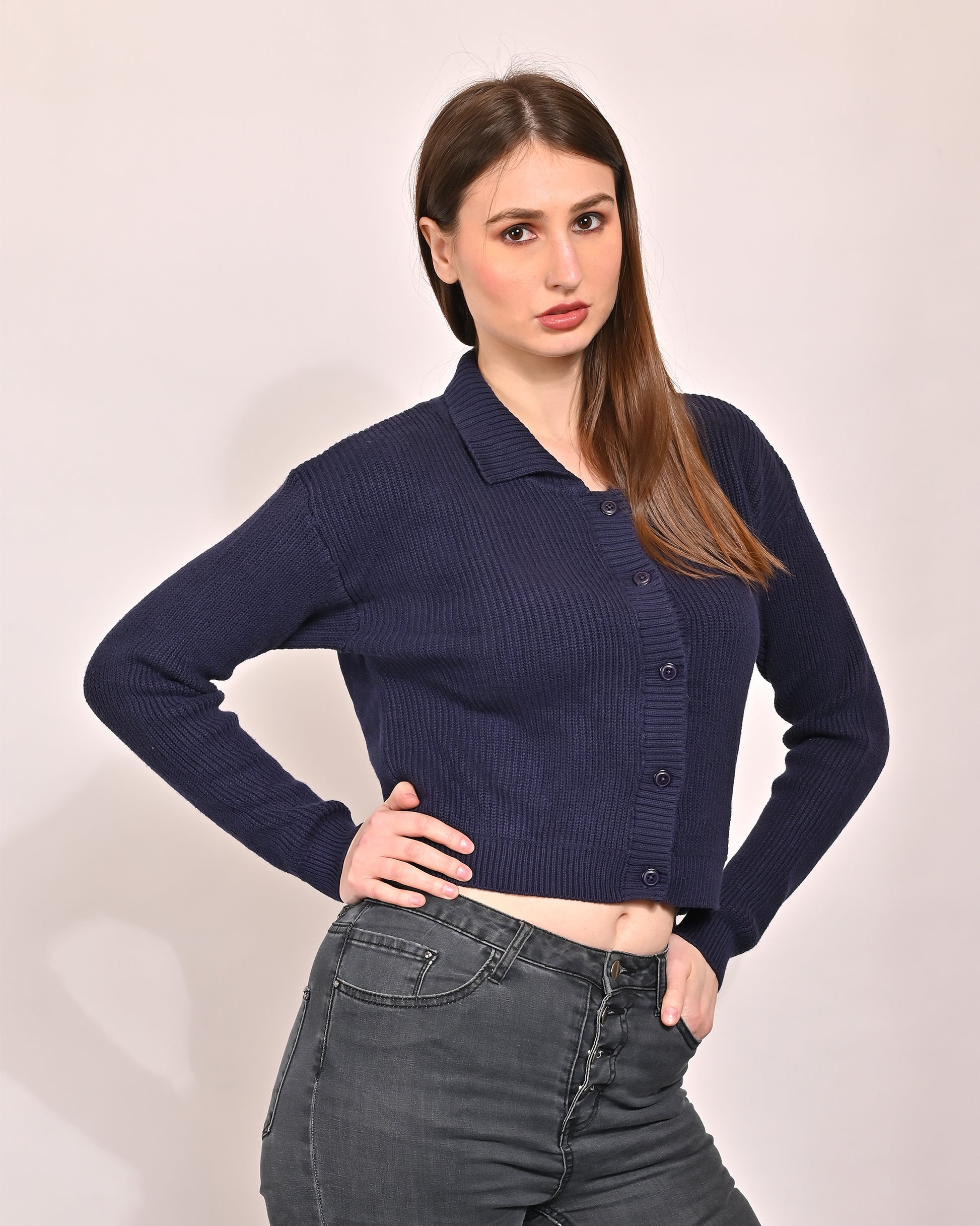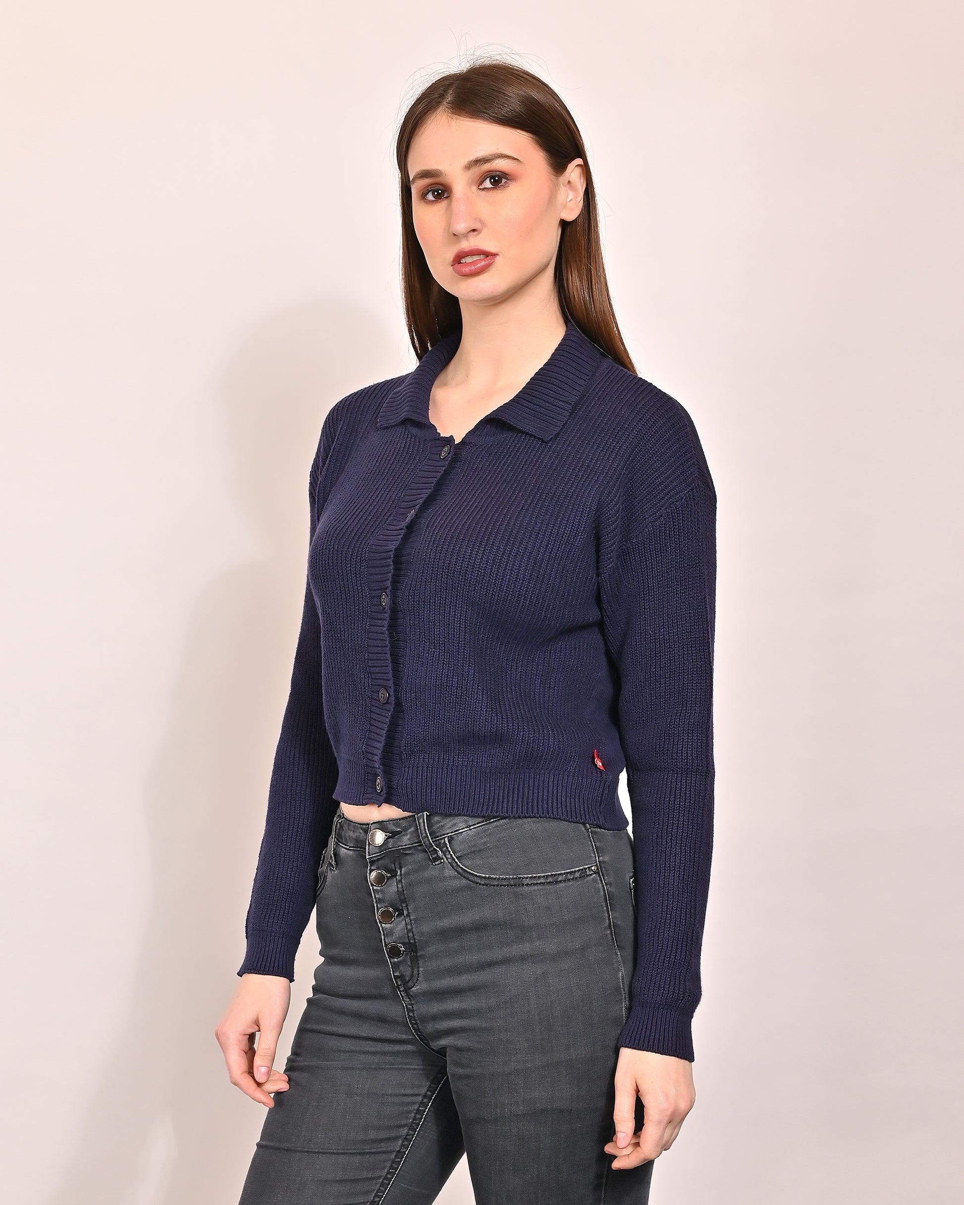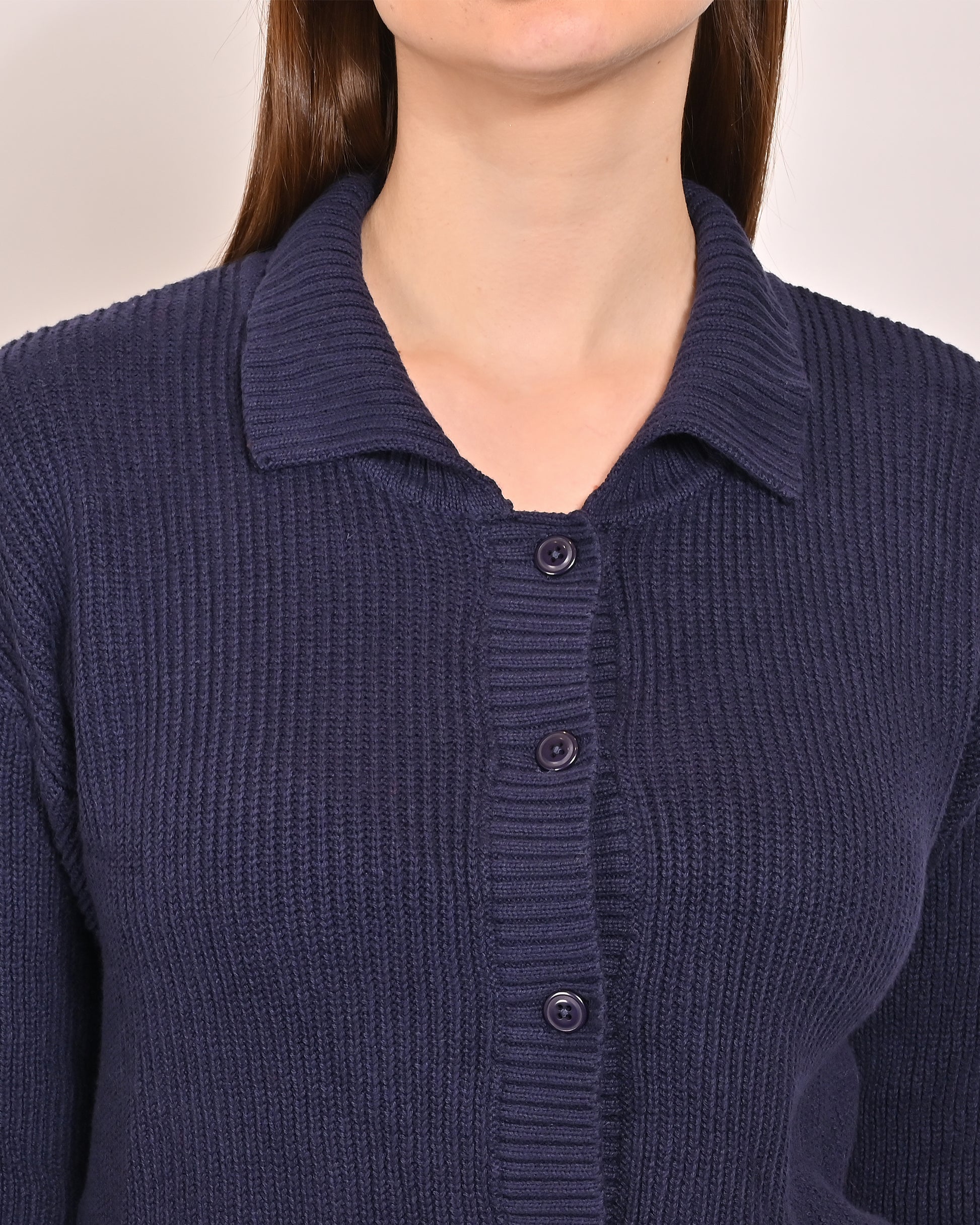 Acrylic Full Sleeve with Shirt Collar Ribbed Blue Cardigan