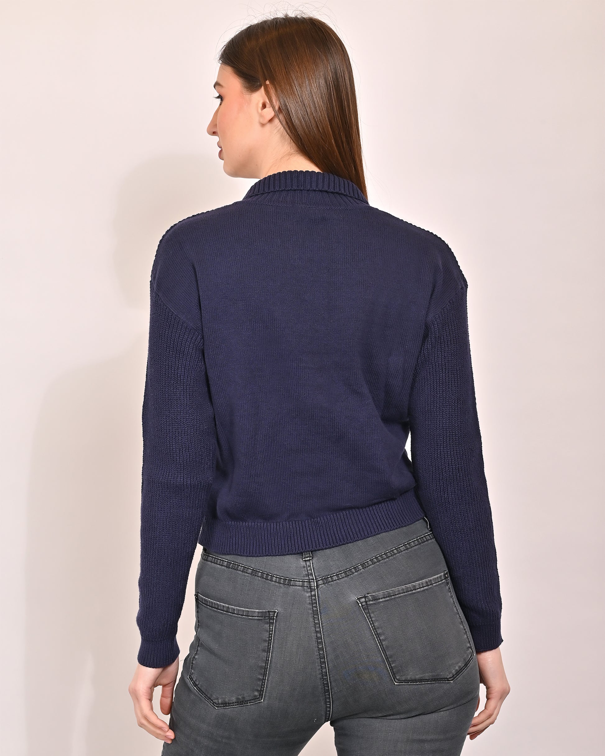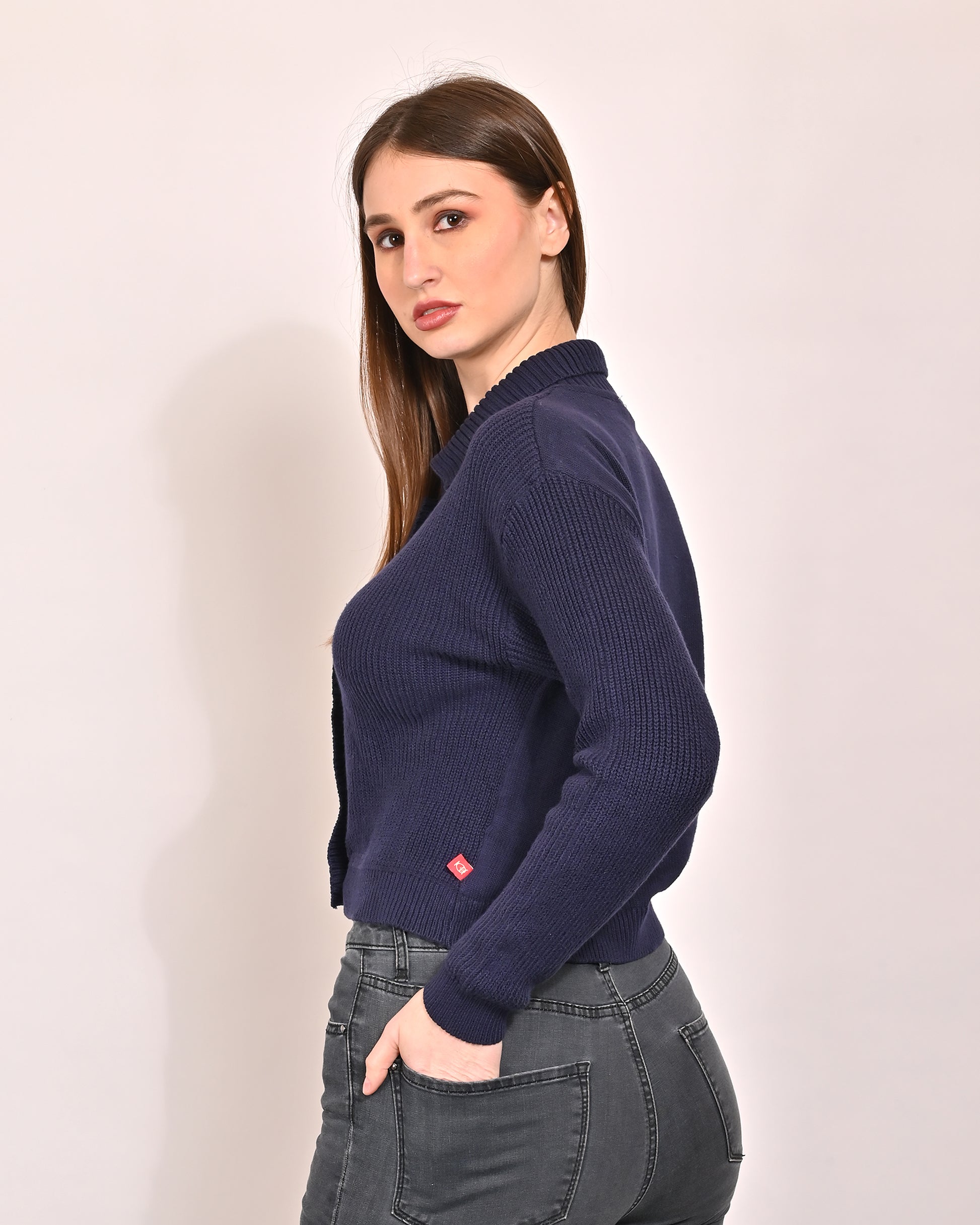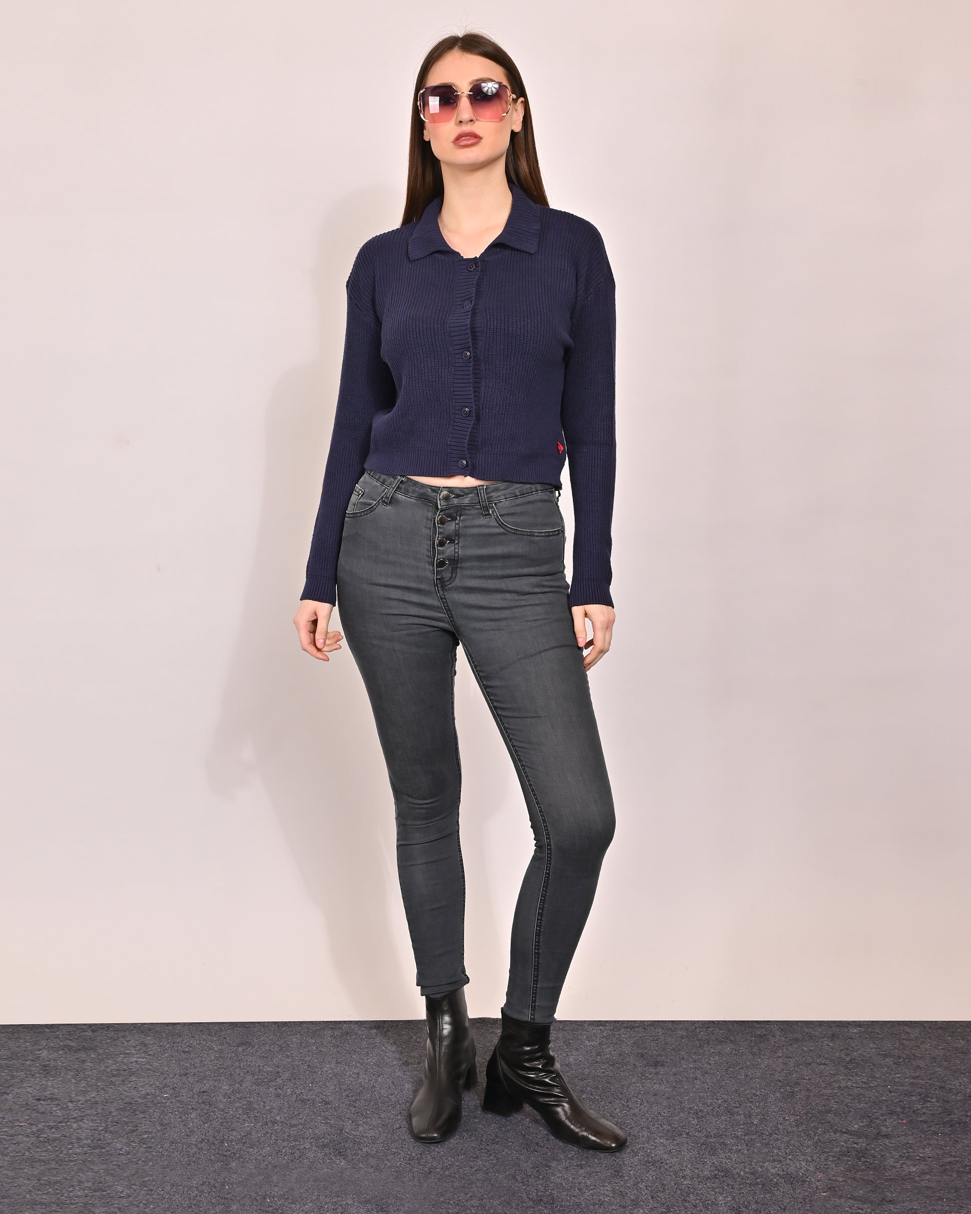 Acrylic Full Sleeve with Shirt Collar Ribbed Blue Cardigan
