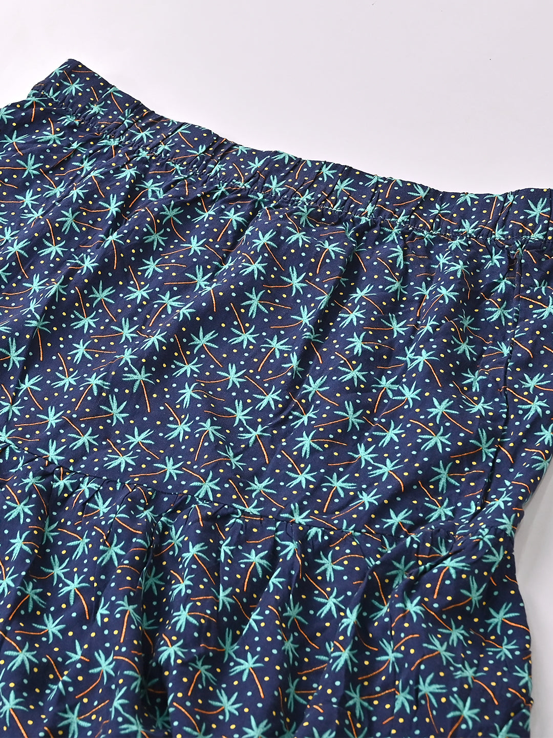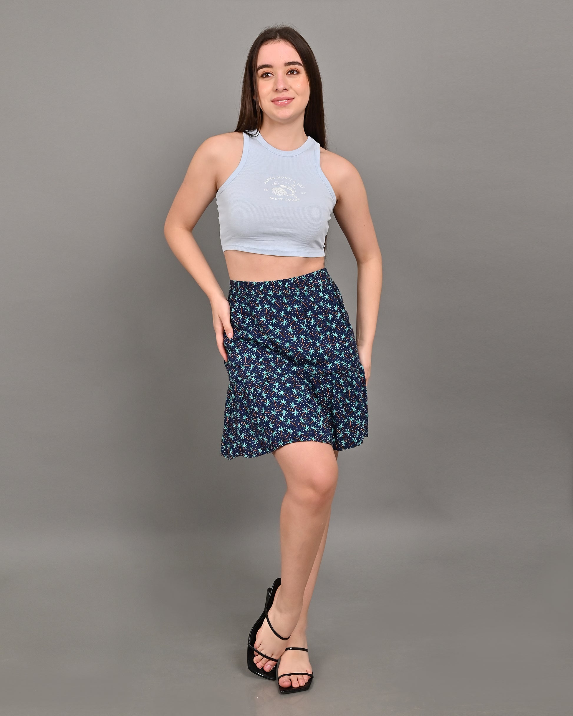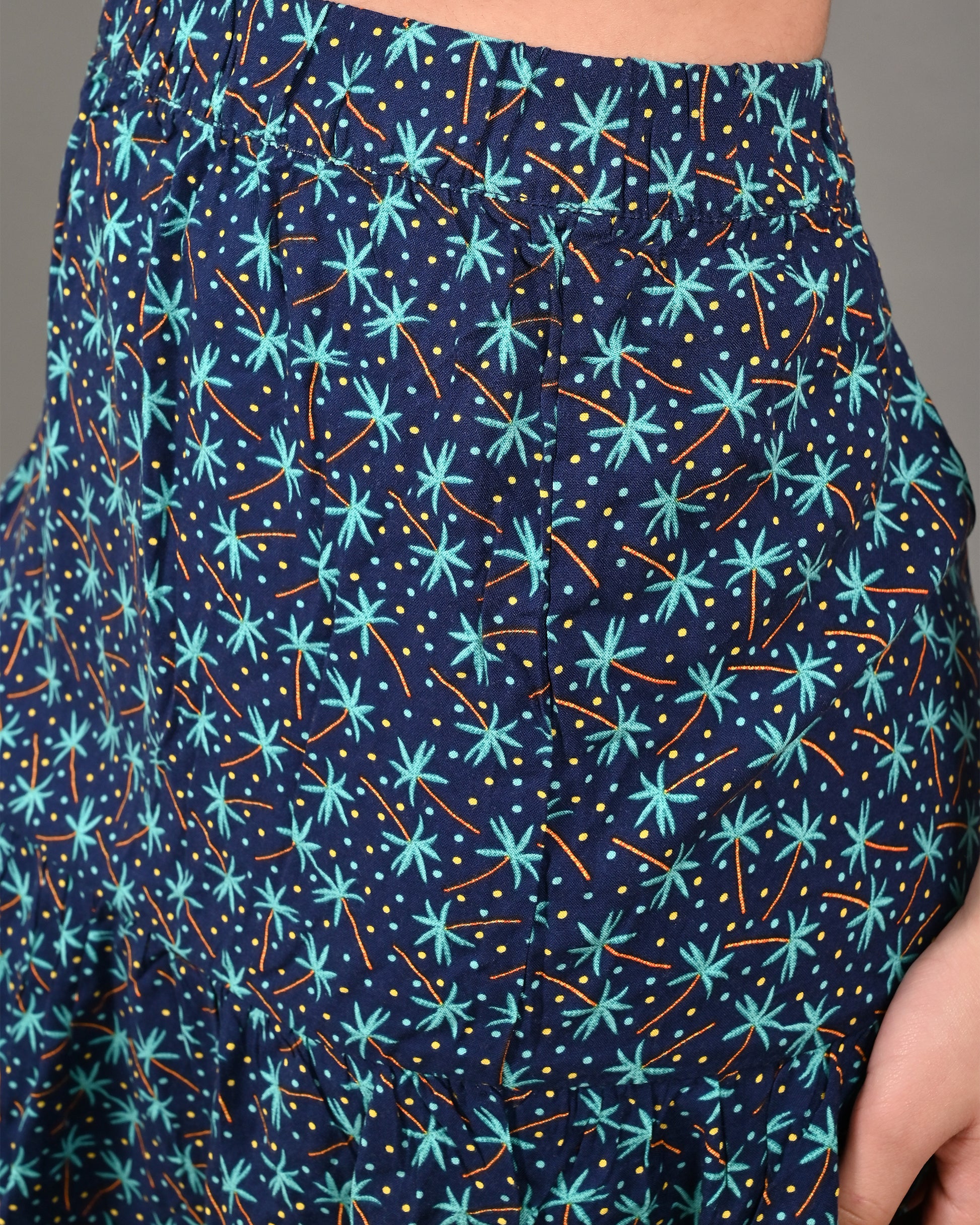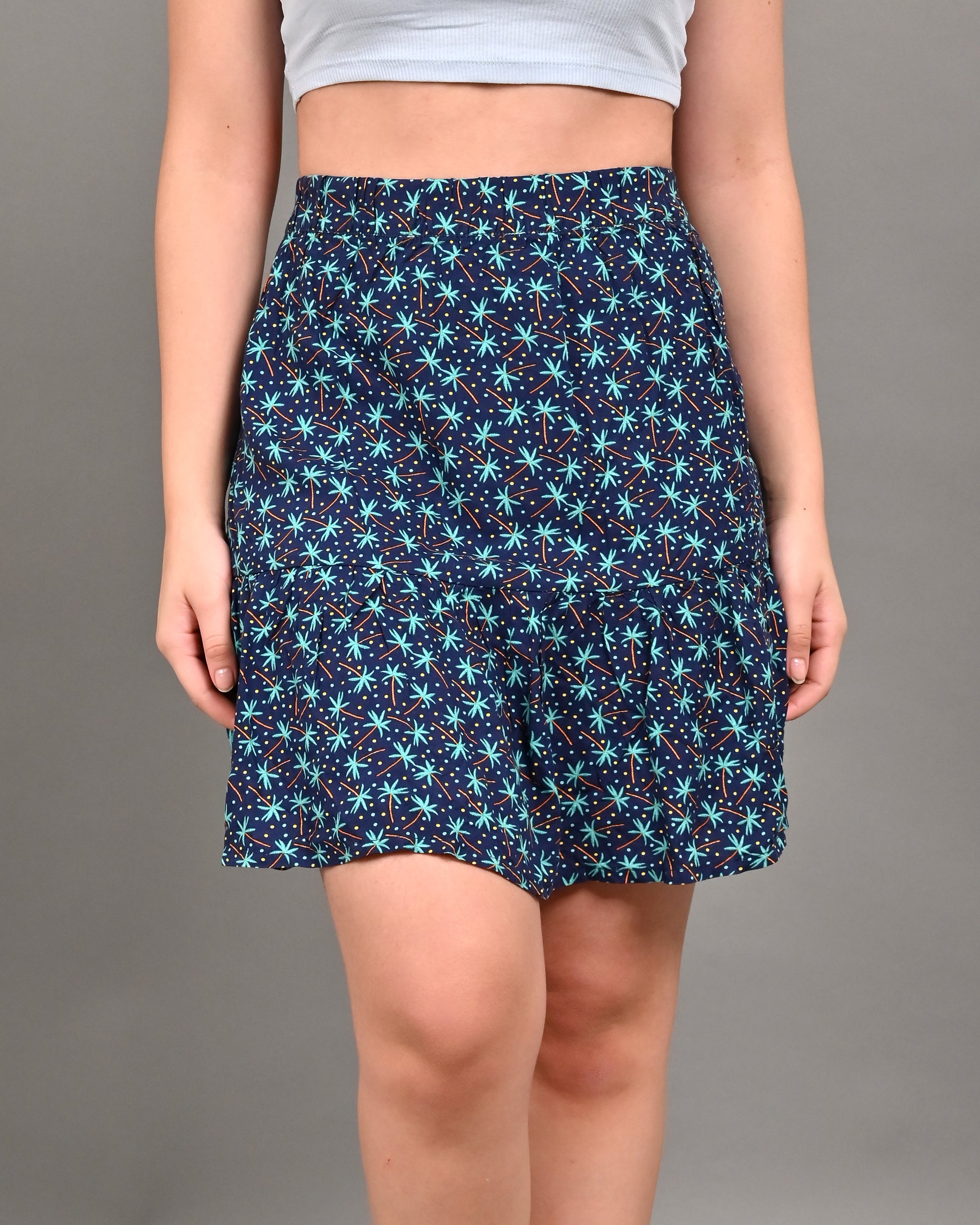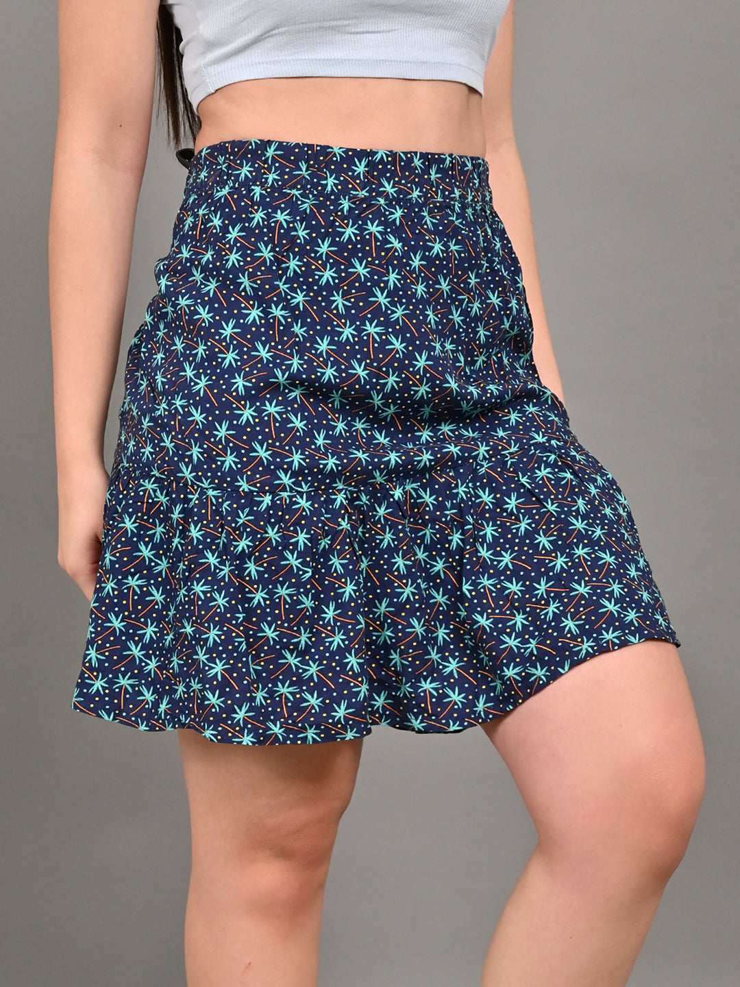 Cotton A-Line Flower Printed Elastic waist Casual Mini Navy Blue Skirt