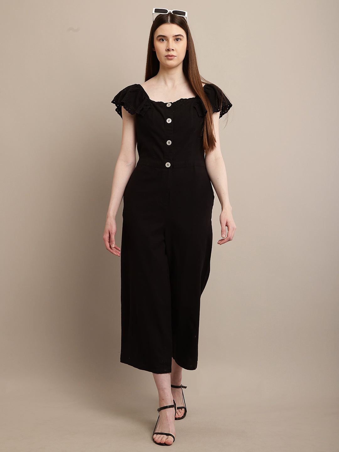 Model is wearing small size. A women's black solid basic jumpsuit featuring a scoop neckline, short sleeves, relaxed fit, and wide-leg pants for a versatile look. Made from a soft, comfortable fabric for all-day wear. Made of 100% Cotton
