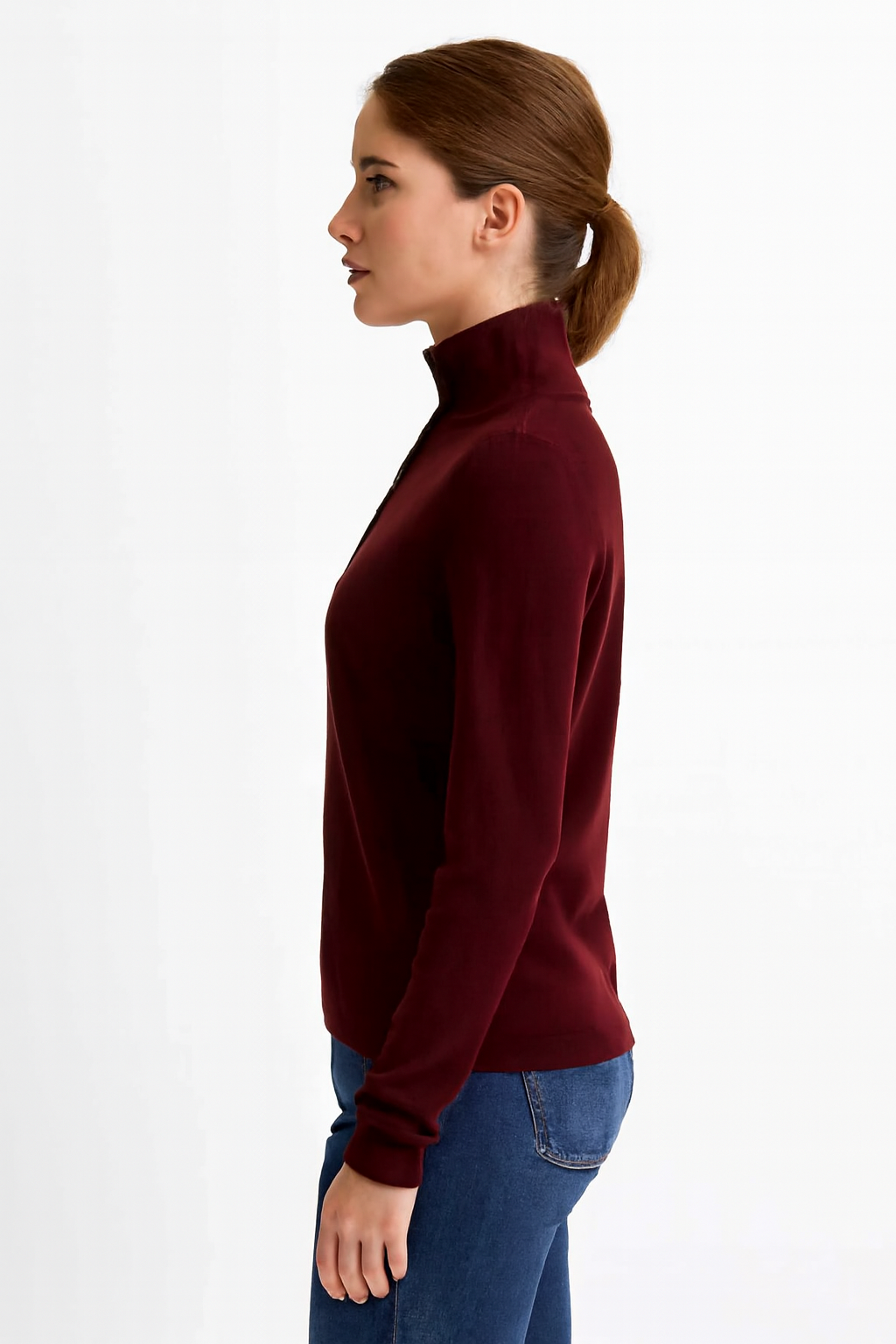 Model is Wearing Small Size. This women’s wine colour sweater is crafted from a premium viscose blend fabric that feels soft and comfortable on the skin. The design features a stylish high neck with a button placket and full-length sleeves. It comes with a relaxed fit where the bust and waist measurements are the same, and the waist has a loose fit, ensuring ease of movement and a flattering everyday look. Made of 84% Viscose, 16% Polyamide.